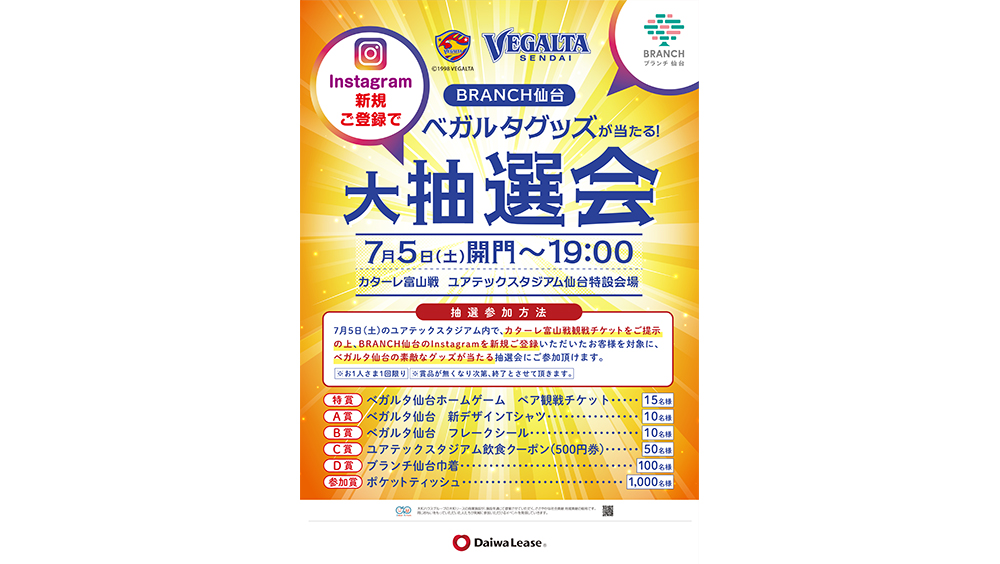 7月5日(土)開催、明治安田J2リーグ 第22節 カターレ富山戦で、ゴールドパートナーBRANCH仙台さまによる、Instagramを新規フォローするとベガルタグッズが当たる大抽選会が開催されます。ぜひご参加ください。