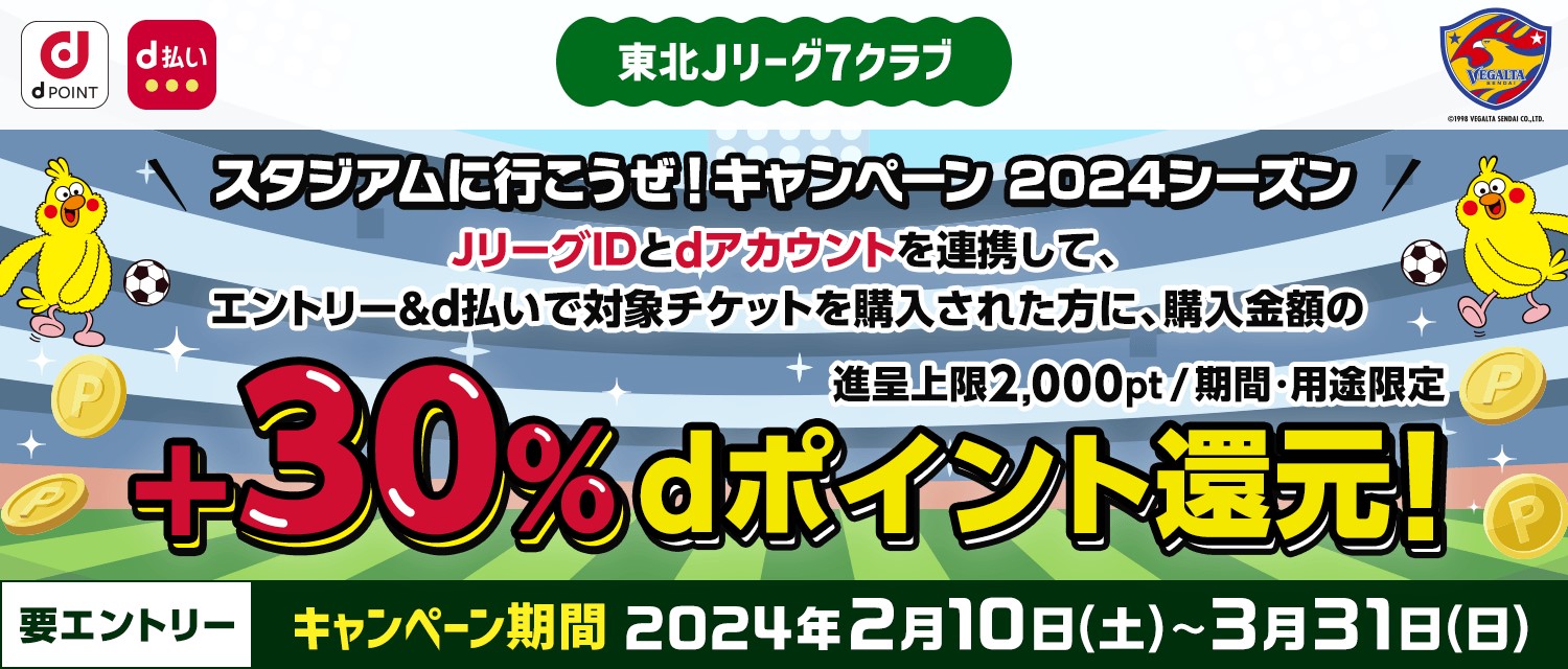 キャンペーン期間中にエントリーのうえ、JリーグIDとdアカウントをID連携し、対象チケットを「d払い」にてお支払いただくと、決済金額の+30%分(最大2,000ポイント/期間中) のdポイント(期間・用途限定) を進呈いたします。