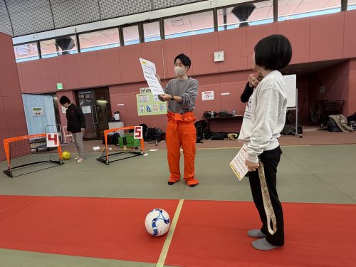 防災に関するクイズをミニゴールにパスして解答。体を動かしながら知識を楽しく学べます。