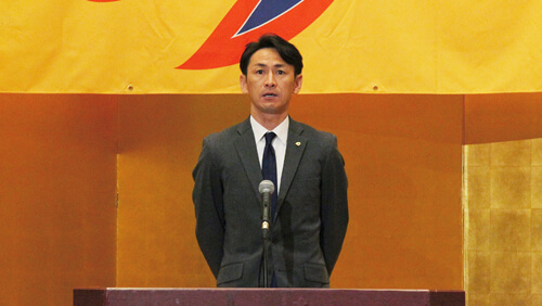 チームの勝利のために、全力で走るという、そういった決意や覚悟を持った選手27名、そしてスタッフ、総勢合わせて42名が、今日ここに集合しています。本日お集まりいただいたみなさまと一致団結して、ぜひ今シーズンこそ目標を達成したいと思っていますので、ぜひ今まで以上に熱いご支援、ご声援をよろしくお願いいたします。
