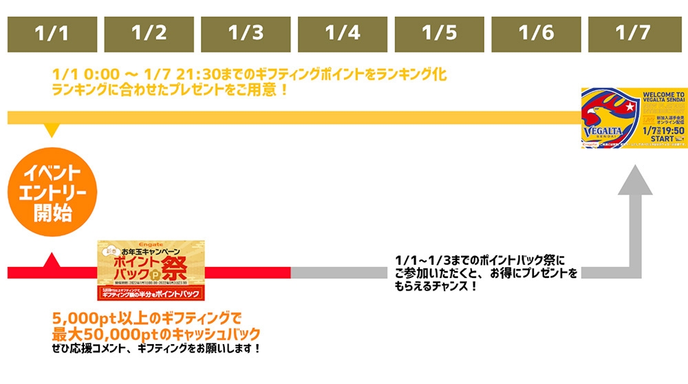 1月1日(土)00:00~1月3日(金)23:59までに、5,000pt以上ギフティングいただくと、ギフティング額の半分がポイントバックされます。