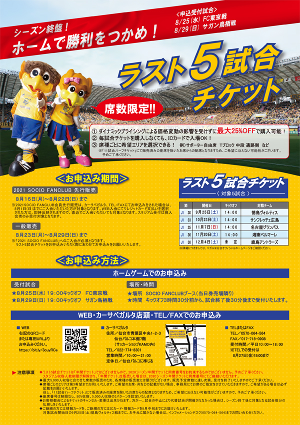 ベガルタ仙台は、9月25日(土)に開催する明治安田生命J1リーグ 第30節 徳島ヴォルティス戦から最終戦まで、ホームゲーム5試合が観戦できる「ラスト5試合チケット」を各席種、席数限定で販売いたします。
