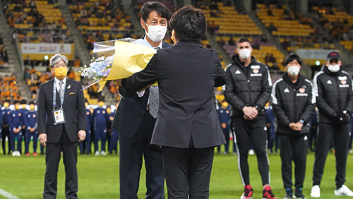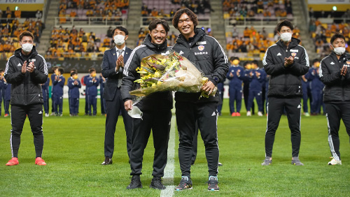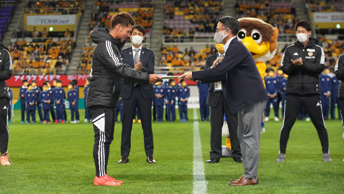 続いて、Jリーグ功労選手賞受賞セレモニーが行われ、角田 誠アシスタントコーチが受賞しました。また、選手を代表して富田 晋伍選手から花束が贈呈されました。