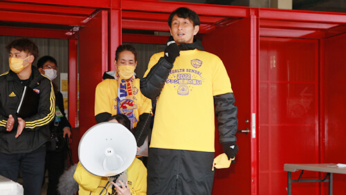 みなさん、こんにちは。1年間、本当に応援ありがとうございました。また、今年は苦しいシーズンでしたが、来シーズンにみなさんとともに戦い、J2優勝、J1昇格を目指して戦いたいと思います。みなさん、一緒に戦ってください。本当に1年間ありがとうございました。