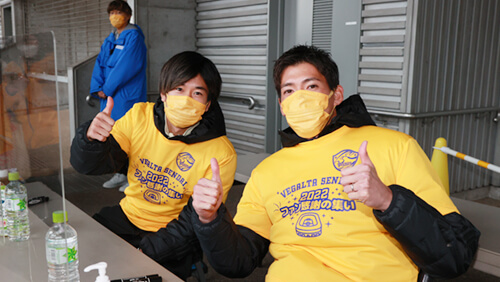 終盤、今シーズンでチームを離れるGK 21 井岡海都選手、DF 13 平岡康裕選手からみなさまへのあいさつをおこないました。スタンドからは2人にむけて、温かいたくさんの拍手、選手のコールをいただきました。ありがとうございました。