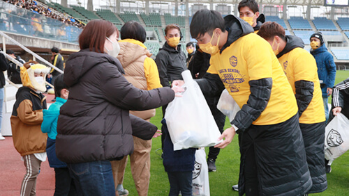 スタンドを4つのブロックに区切り、それぞれ選手とみなさまの間でじゃんけん勝負を行い、勝ち残った方はピッチに降り、選手から賞品を直接受け取っていただきました。選手も趣向を凝らしたじゃんけんで挑み、盛り上がりました。