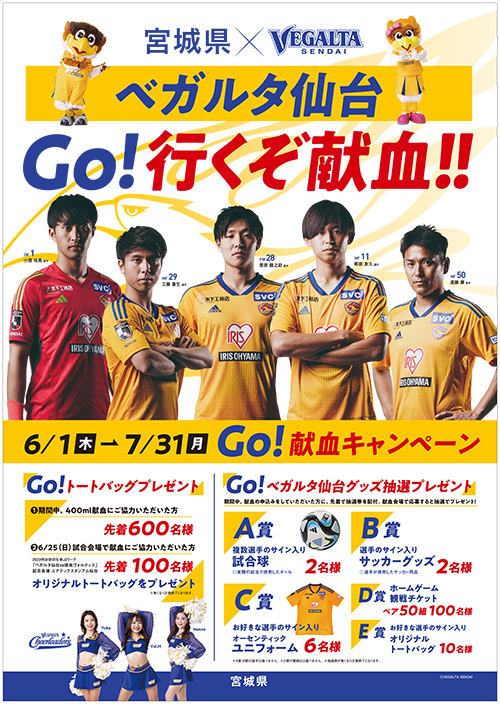 献血の普及推進を図るため、宮城県とベガルタ仙台がコラボして、6月1日(木)~7月31日(月)まで「ベガルタ仙台 Go! 行くぞ 献血!!」キャンペーンを展開します。