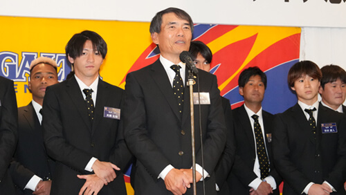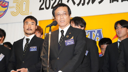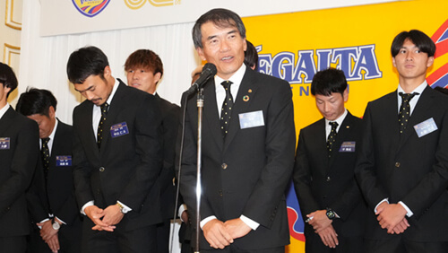 みなさんこんにちは。本日は2024ベガルタ仙台感謝の集いにお集まりいただき誠にありがとうございます。昨日のプレーオフ進出決定という感動の瞬間からまだ余韻が冷めやらない中での、この会でございます。