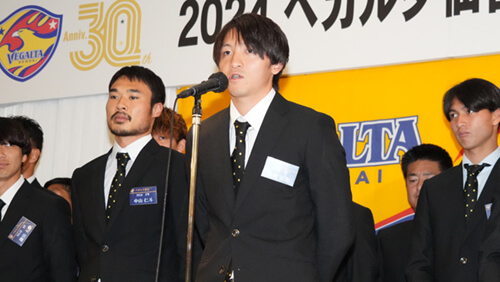 集いの冒頭では株式会社ベガルタ仙台代表取締役社長 板橋秀樹、選手を代表して DF 25 真瀬拓海選手からみなさまへ2024シーズンのサポートへの感謝を述べました。