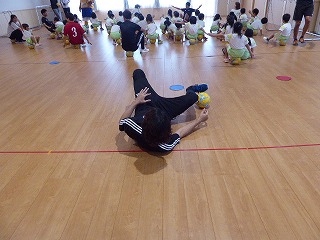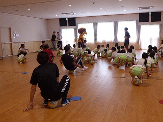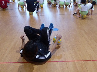 ボールに座りバランスをとる練習ですが、
