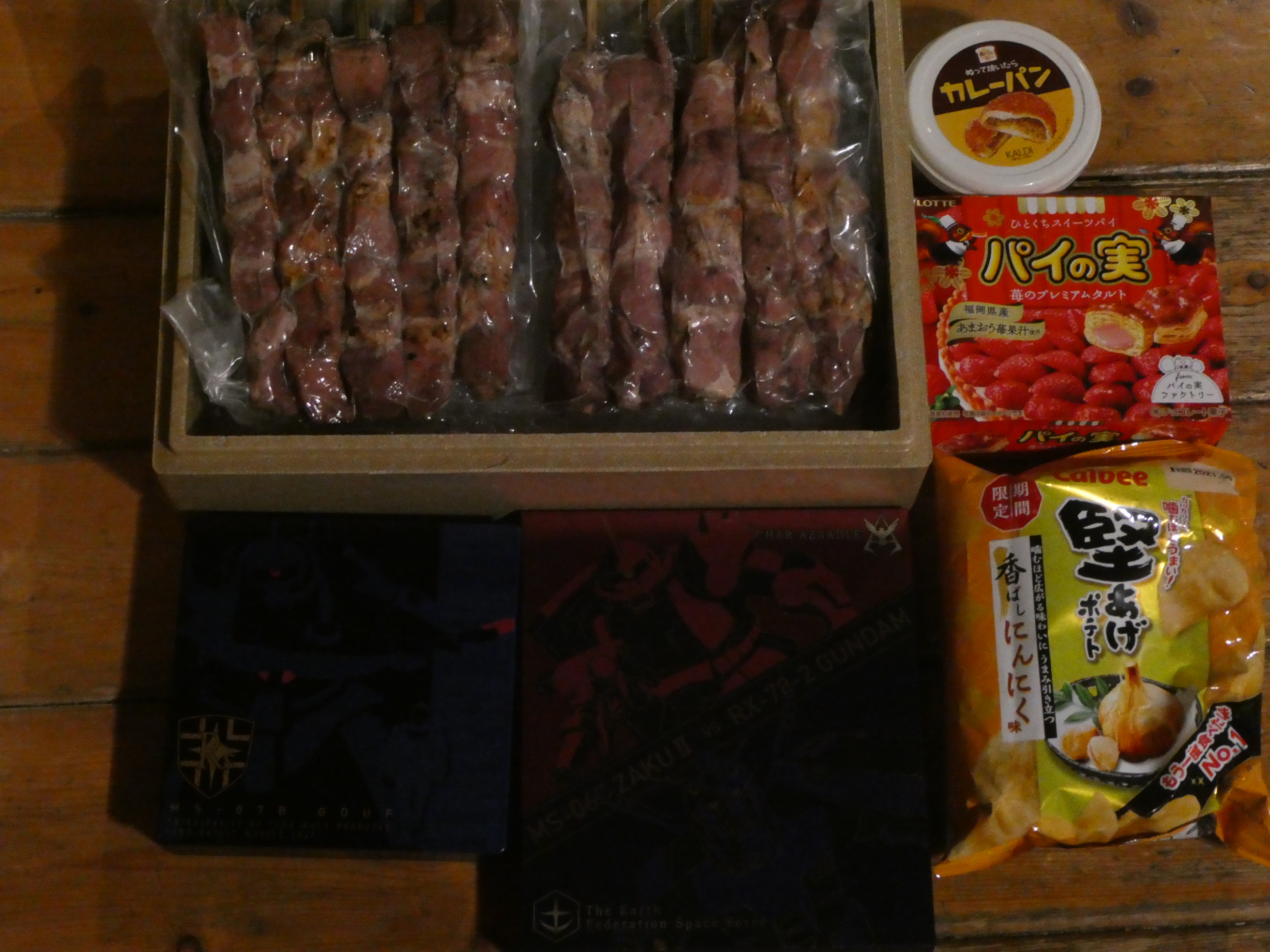 あの串刺しハムベーコンと数々のガンダムお菓子。