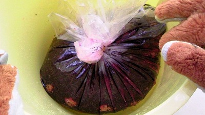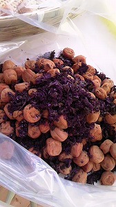 土用干しをおこなった梅に、最初につけた時に出た梅エキスと赤シソを混ぜて~