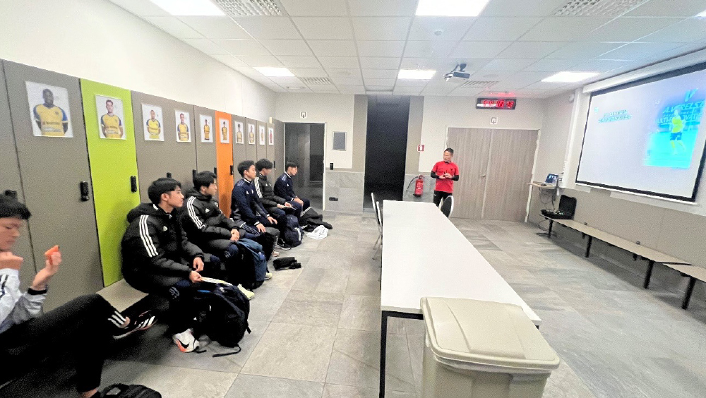 10月16日(水)は、ベルギーのシント=トロイデンVVに訪問。まず、大王わさびスタイエンスタジアムを見学し、アカデミーダイレクターの高野剛氏よりシント=トロイデンVVのクラブの説明を受け、その説明の中でヨーロッパで評価される選手の特徴などを聞くことができた。