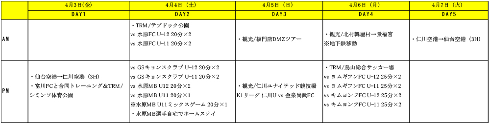 2026年4月3日から4月7日まで、ベガルタ仙台ジュニアの小学5年生11名と6年生9名の選手20名とスタッフ3名で韓国遠征を実施いたしました。