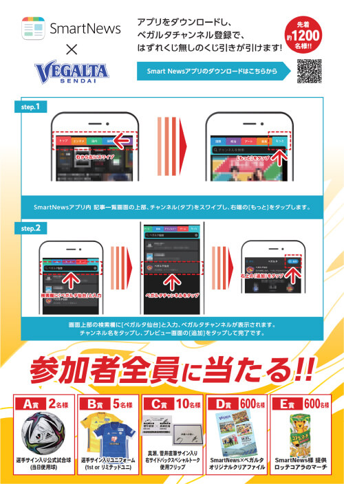 ニュースアプリ「SmartNews」をダウンロードいただき、「ベガルタチャンネル」を登録した画面をご提示いただくと、先着約1,200名様限定のはずれくじ無しのくじ引きにご参加いただけます。