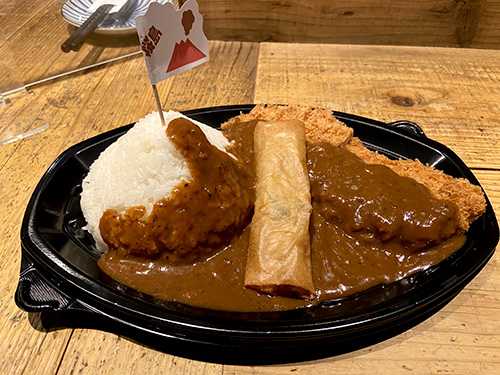 赤﨑秀平選手 出身地の鹿児島県産ブランド『さつま知覧どり』の230gのビックカツに、好物の春巻きを添えた超大盛りカレー!2人で食べてもお腹いっぱいの食べ応えあり。