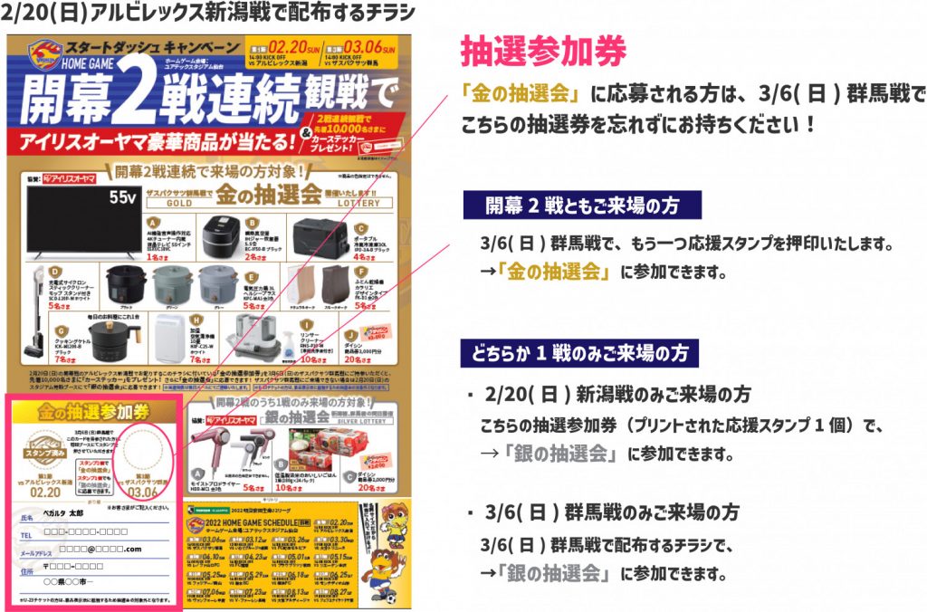 ベガルタ仙台は、2月20日(日)に開催いたします、2022明治安田生命J2リーグ第1節アルビレックス新潟戦および、3月6日(日)第3節ザスパクサツ群馬戦で、開幕2戦スタートダッシュキャンペーンを実施いたします。多くのファン、サポーターのみなさまに、スタジアムへ足を運んでいただきたいとの思いから、ユニフォームスポンサーであるアイリスオーヤマ株式会社さまのご協賛を賜り、同社商品が当たる抽選会をスタジアムで実施いたします。ご協賛いただきましたアイリスオーヤマ株式会社さまには改めて感謝申し上げます。