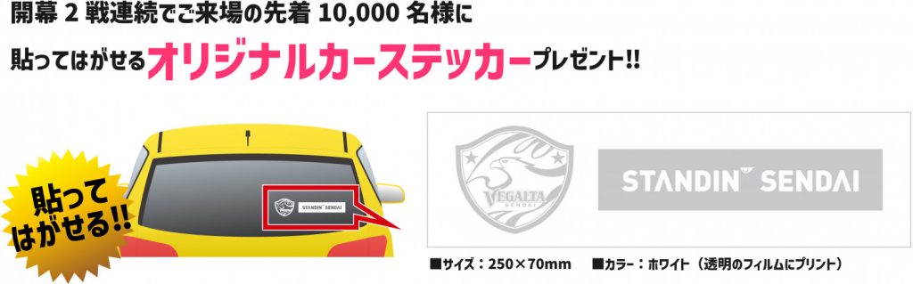 抽選参加券を、3月6日(日) ザスパクサツ群馬戦にお持ちいただくと、スタジアム内の特設ブースでもう一つ応援スタンプを押印いたします。スタンプが2個揃った方は、抽選参加券を特設ブースの抽選箱に入れていただくと、アイリスオーヤマの豪華商品が当たる「金の抽選会」に参加できます。さらに、先着10,000名さまに「貼ってはがせるオリジナルカーステッカー」をプレゼントいたします。