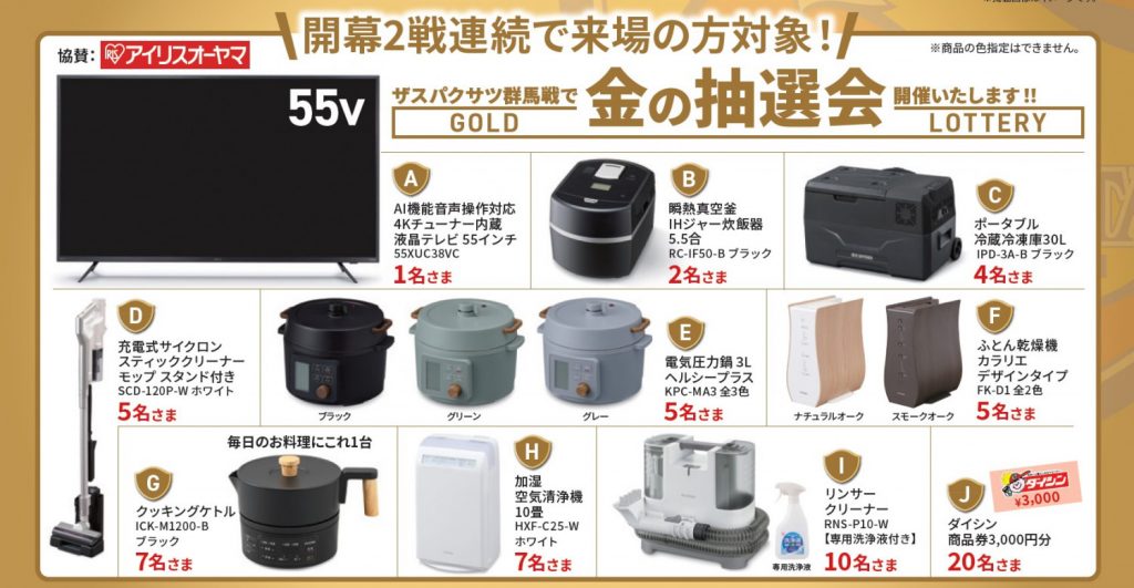 開幕2戦ご来場 アイリスオーヤマの豪華賞品が当たる!金の抽選会