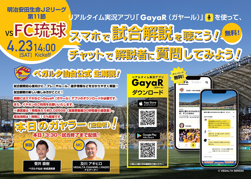 ベガルタ仙台公式生解説 リアルタイム実況アプリ「GayaR」を使ってスマホで聴ける試合解説を実施いたします。チャットで解説者に質問もできます!