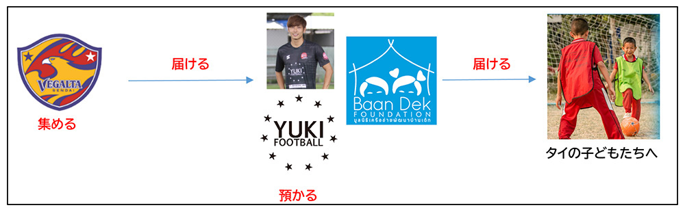 ご提供いただいたグッズは、クラブが責任をもって整理、保管し2022シーズンオフにタイへお届けします。その後、大久保剛志選手とYUKI FOOTBALL ACADEMY、Baan Dek財団を通じ、タイのスラムや建設現場のキャンプで暮らす、社会的に弱い立場の子どもたちにお届けいたします。