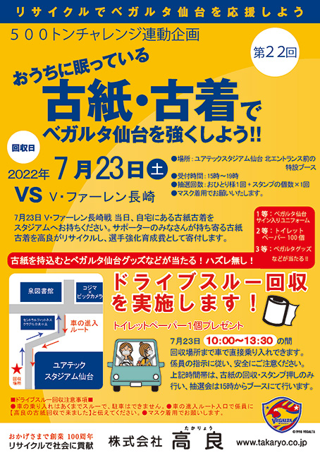 7月23日(土)開催、2022明治安田生命J2リーグ 第28節 V・ファーレン長崎戦にて、ベガルタ仙台のシルバースポンサー(株)高良様の企画による、リサイクルを通じたベガルタ仙台応援イベント『古紙・古着でベガルタ仙台を強くしよう!!』を実施いたします。