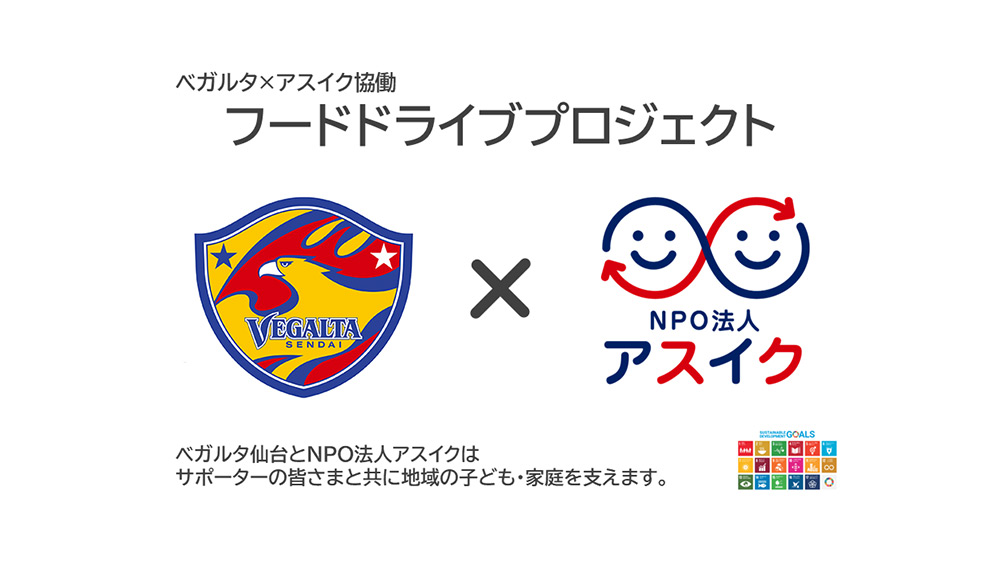 2月26日(日)開催、明治安田生命J2リーグ 第2節 栃木SC戦にて、ベガルタ仙台とNPO法人アスイクは、双方で取り組むSDGs活動の一環として、「フードドライブ」を実施いたします。