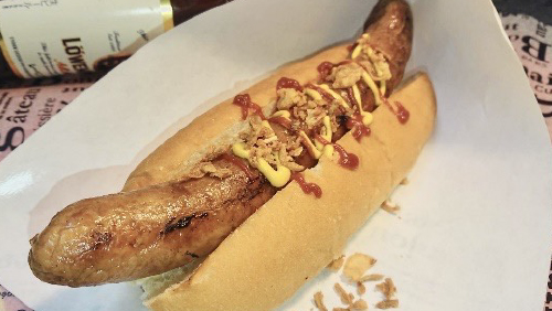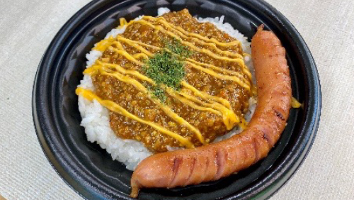 自家製フランクフルトにカレーとチーズを練りこみフライドオニオンをトッピング!