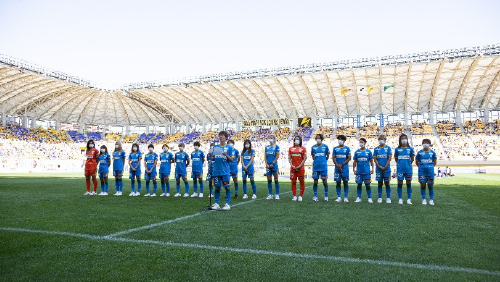 マイナビ仙台レディース松本 真未子選手と、マイナビpresentsサッカースポーツ少年団観戦招待に参加した小学生2名が、両チームキャプテンと主審へ向けてキックインを実施いたします。
