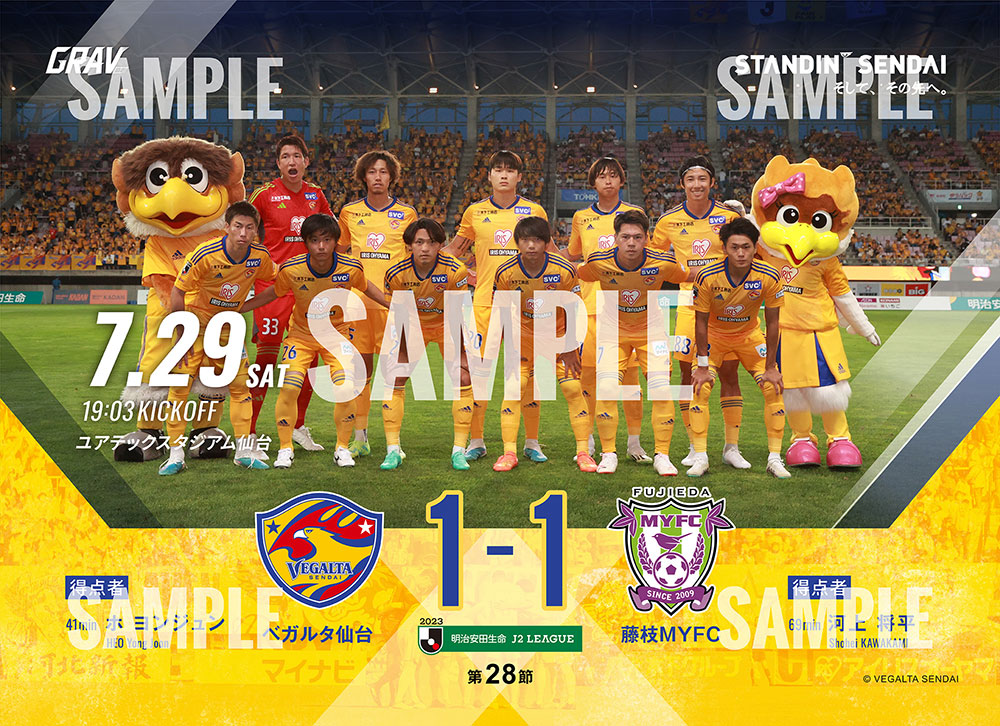 7月29日(土)開催、明治安田生命J2リーグ 第28節 藤枝MYFC戦のブロマイドはただいまより購入可能です。ホームゲームにご来場いただき楽しんだ方も、DAZNで観戦いただいた方も、集めて楽しめる商品となります。ぜひ、2023シーズンのベガルタ仙台 全ホームゲームのブロマイドをコンプリートしてください。