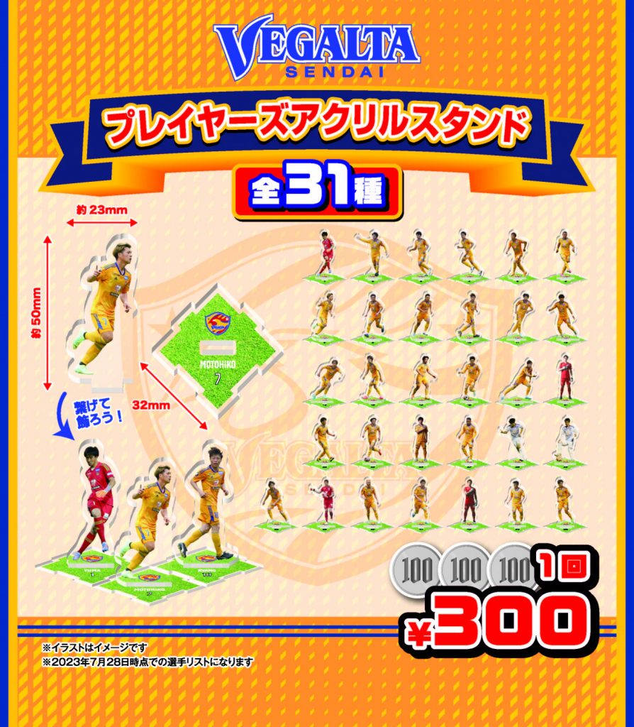ベガガチャからは、選手がプレーしている写真がデザインされたアクリルスタンドが登場。