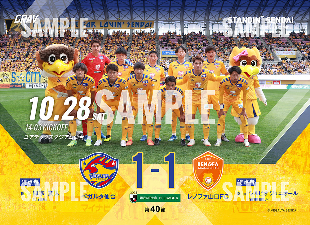 10月28日(土)開催、明治安田生命J2リーグ 第40節 レノファ山口FC戦のブロマイドはただいまより購入可能です。ホームゲームにご来場いただき楽しんだ方も、DAZNで観戦いただいた方も、集めて楽しめる商品となります。ぜひ、2023シーズンのベガルタ仙台 全ホームゲームのブロマイドをコンプリートしてください。