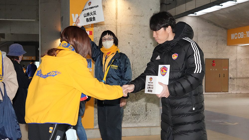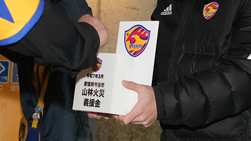 4月12日、明治安田 J2リーグ 第9節 FC今治戦にて実施いたしました「令和7年3月愛媛県今治市 山林火災義援金」募金について、みなさまからいただいた義援金額は381,434円となりましたのでご報告いたします。