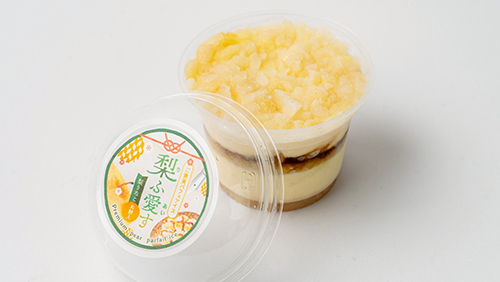 宮城県利府高等学校自然科学部の高校生たちが開発した利府梨のパフェアイス「梨ふ愛す(リフアイス)」。