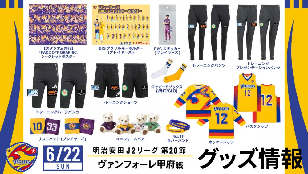 6月22日(日)明治安田J2リーグ第20節 ヴァンフォーレ甲府戦のグッズ情報をお届けいたします!今節は遂に選手着用ウェアのトレーニングパンツ類が発売開始☆その他、全選手対応のリストバンドやアクリルキーホルダーPVCステッカー、「FACE OFF GRAPHIC」第2弾となるシークレットポスターなど選手グッズも多数登場!