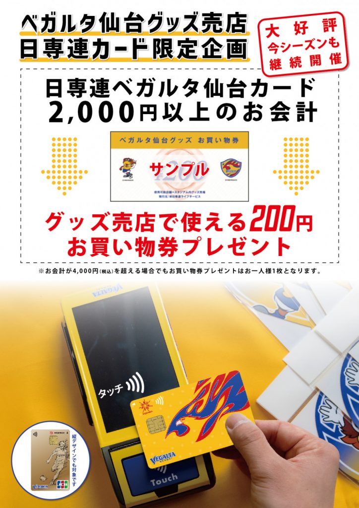 2025シーズンも引き続き、日専連ベガルタ仙台カードでお買い物いただいたお客様へ200円クーポン券をプレゼントいたします。