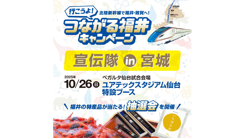 10月26日(日)開催、明治安田J2リーグ第34節 サガン鳥栖戦にて、北陸新幹線の福井・敦賀開業で身近になった宮城県のみなさまに福井県の魅力をPRする「“行こうよ”つながる福井キャンペーンブース」が出展されます。