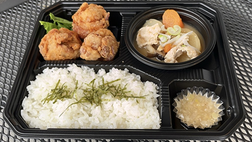 自家製出汁で作る豚汁と米粉のジャンボ唐揚げEkoiの人気商品が両方楽しめるお弁当です。