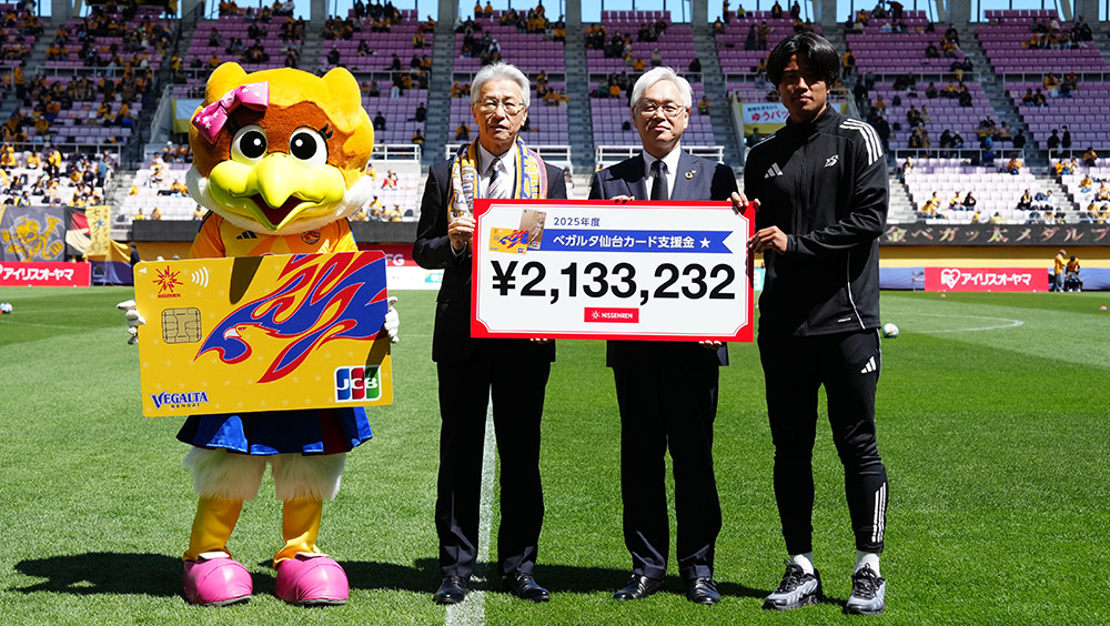 4月25日(土)開催、明治安田J2・J3百年構想リーグ 第12節 モンテディオ山形戦にて、2025年3月~2026年2月までの1年間にサポーターのみなさまにご利用いただきましたご利用金額の一部をベガルタ仙台へ寄付いただきました。過去最高額の強化支援金となりました。みなさま、ベガルタ仙台カードのご利用ありがとうございます。