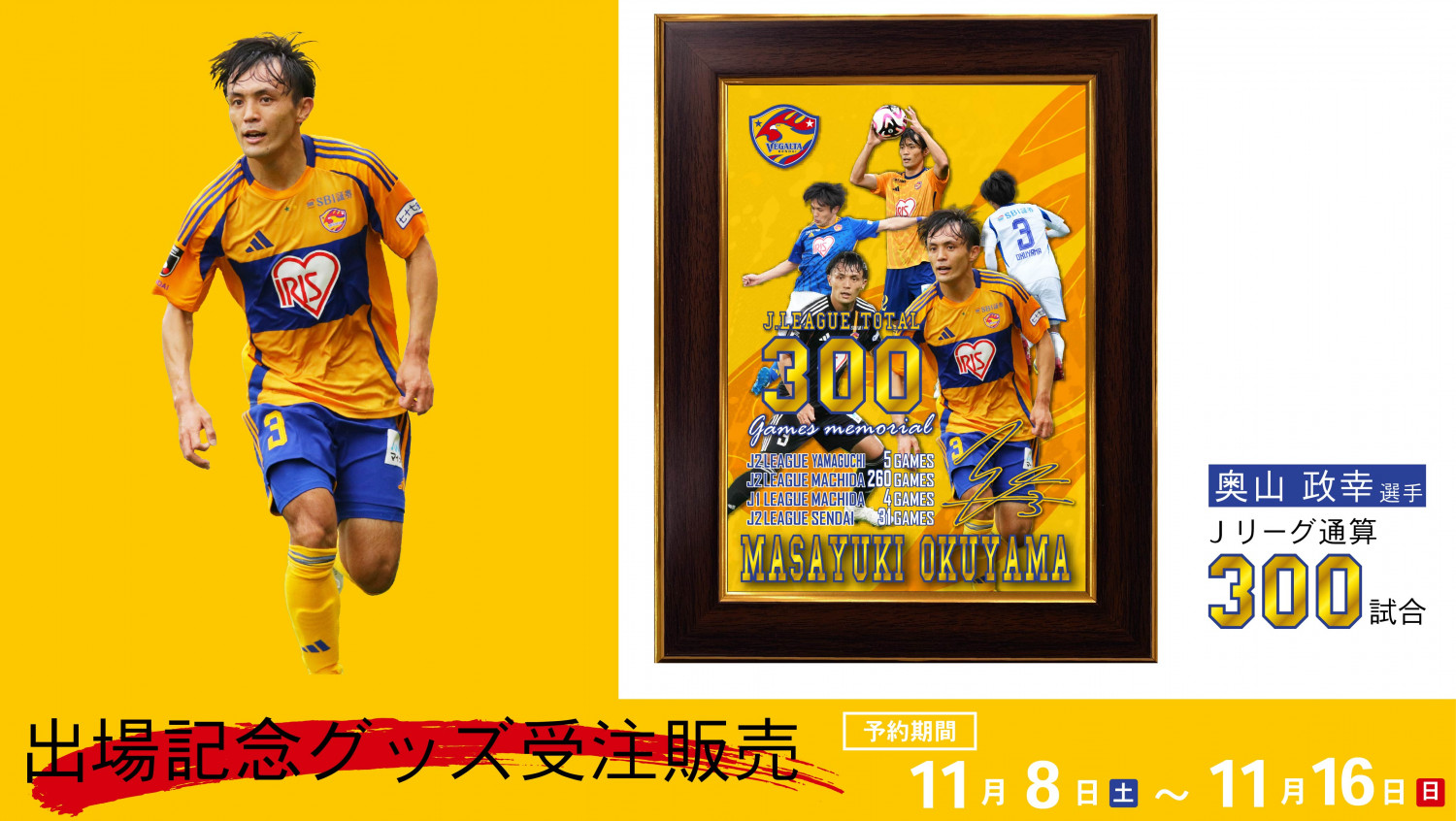 10月26日(日)サガン鳥栖戦でJリーグ通算300試合出場を達成した奥山 政幸選手の出場記念フォトフレームを受注販売いたします。