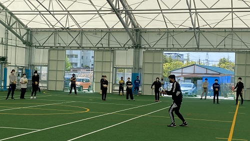最後は、ベガルタ仙台アカデミーコーチによるボール運動。パス練習、手をつないでのゲーム、元気に体を動かします。