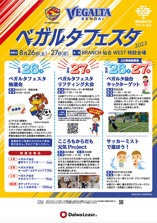 ベガルタ仙台 ゴールドスポンサー 大和リース株式会社さまが運営するブランチ仙台にて、8月26日(土)、27日(日)に「ベガルタフェスタ 2023」が開催されます。