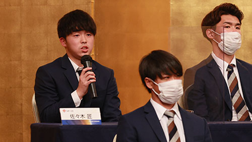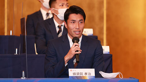 ご報告会では、株式会社ベガルタ仙台代表取締役社長 佐々木 知廣、原崎 政人監督、選手を代表してDF 16 吉野 恭平選手が2021シーズンのみなさまのご支援、ご声援に感謝を込めてあいさついたしました。