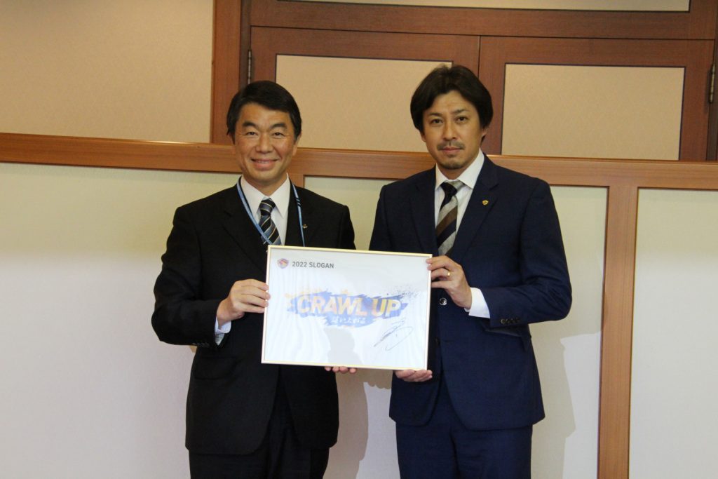 村井知事からは「なんとしてもJ1に1年で復帰していただきたい」と力強い激励のお言葉をいただきました。原崎監督も「戦えるメンバーが揃ったと思っています」とキャンプを前に新チームの顔ぶれへの手応えを述べました。