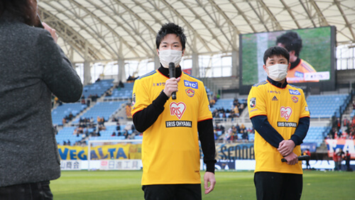 キックオフ前、ピッチ上では株式会社ベガルタ仙台代表取締役社長 佐々木知廣が開幕にあたり「シーズン終了時、一緒に1年でJ1復帰、しかも優勝で復帰するという栄冠を手にするために、また一緒にたたかっていただき、喜びをわかち合いたいと思います(一部抜粋)」とご来場のみなさまへあいさつ、続いて本日のマッチデースポンサーである木下グループさま所属の水谷隼選手、張本智和選手によるトークショーを行いました。