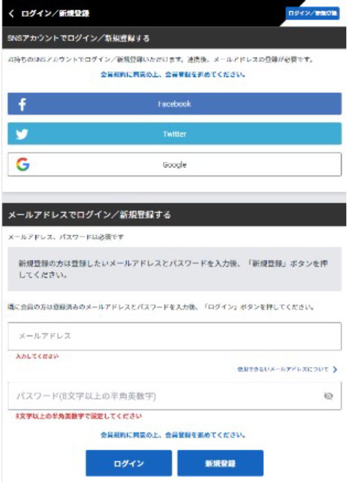 ・「SNSアカウントで会員登録」または「ニックネーム・メールアドレス・パスワードを入力」から新規登録