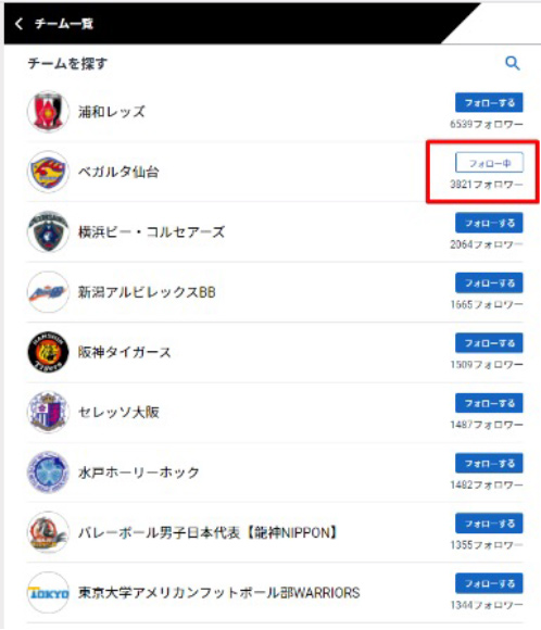 ② チーム一覧からベガルタ仙台をフォロー