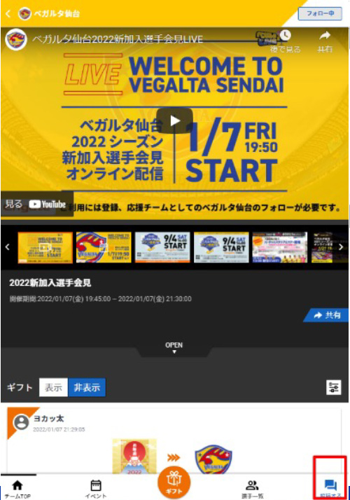 「ギフト」または「投稿」から選手への質問を投稿