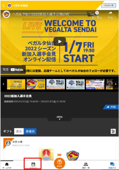 エンゲートのベガルタアカウントから「イベント」ページよりエントリー