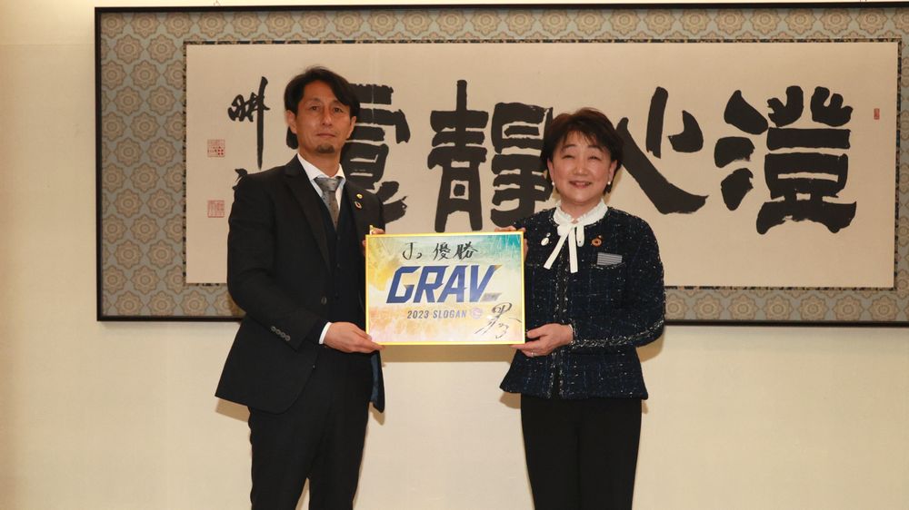 伊藤監督の思いが反映された「GRAV 協創」のスローガンパネルに、「J2優勝」の目標を直筆で書き加えて寄贈しました。郡市長は、前回の卯年が東日本大震災であったことに触れ、「何よりもJ2優勝できるようにがんばってほしい」と大きな節目での期待を込めたお言葉をいただきました。